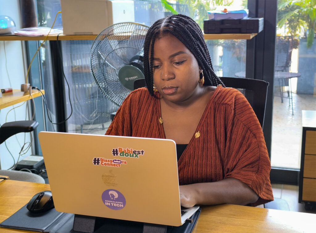 Andrea Longa working on her laptop at Ivoire Trade Center, Cocody, Abidjan, April, 2026. Photo: Hervé Akoi, bird story agency